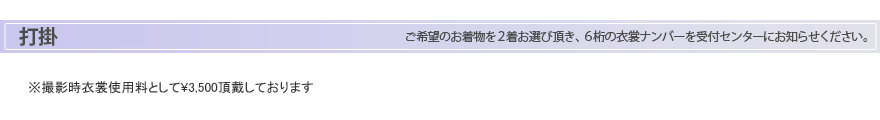 ※6桁の衣装ナンバーをお控えの上、受付センターまでご連絡ください。尚、衣装のご手配の関係上、ご使用日7日前までのご予約をお願いします。